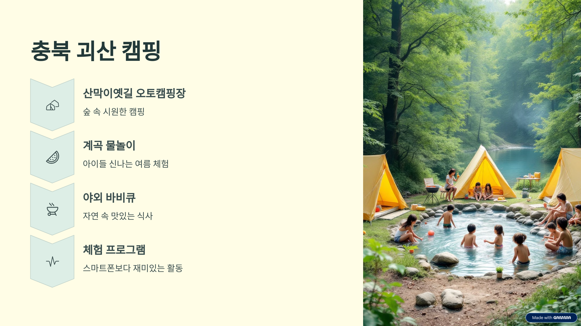 가족 캠핑 좋아하시나요? 괴산은 캠핑족들 사이에서 이미 유명한 핫플이에요! 특히 ‘산막이옛길’ 근처 오토캠핑장은 숲 속에 있어 시원하고 공기도 맑아 힐링 그 자체랍니다. ⛺