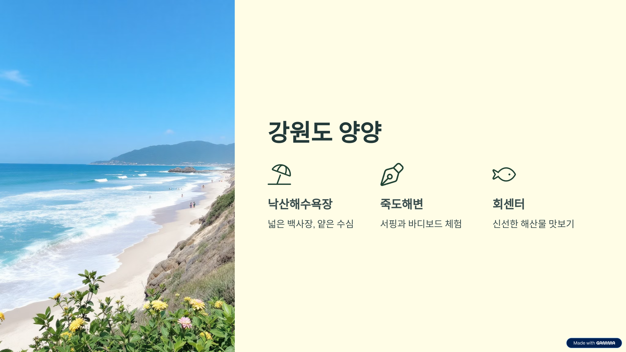 특히 ‘낙산해수욕장’은 넓은 백사장과 얕은 수심 덕분에 가족 단위 방문객에게 딱이랍니다. 근처 펜션도 가격 대비 훌륭하고, 저녁에는 회센터에서 신선한 회 한 접시 어떠세요? 🐟