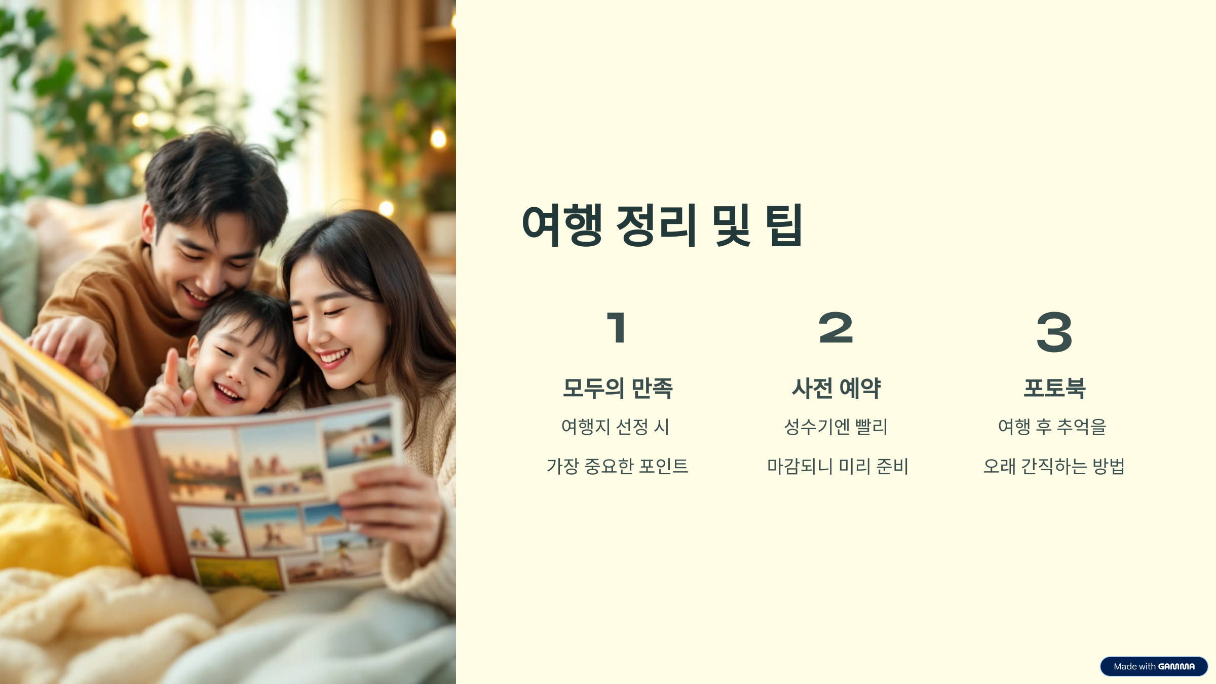 가족여행은 단순한 ‘이벤트’가 아니라, 가족 사이를 더욱 끈끈하게 해주는 ‘경험’입니다. 📸 여행지 선정 시 가장 중요한 건 ‘모두의 만족’이라는 점!