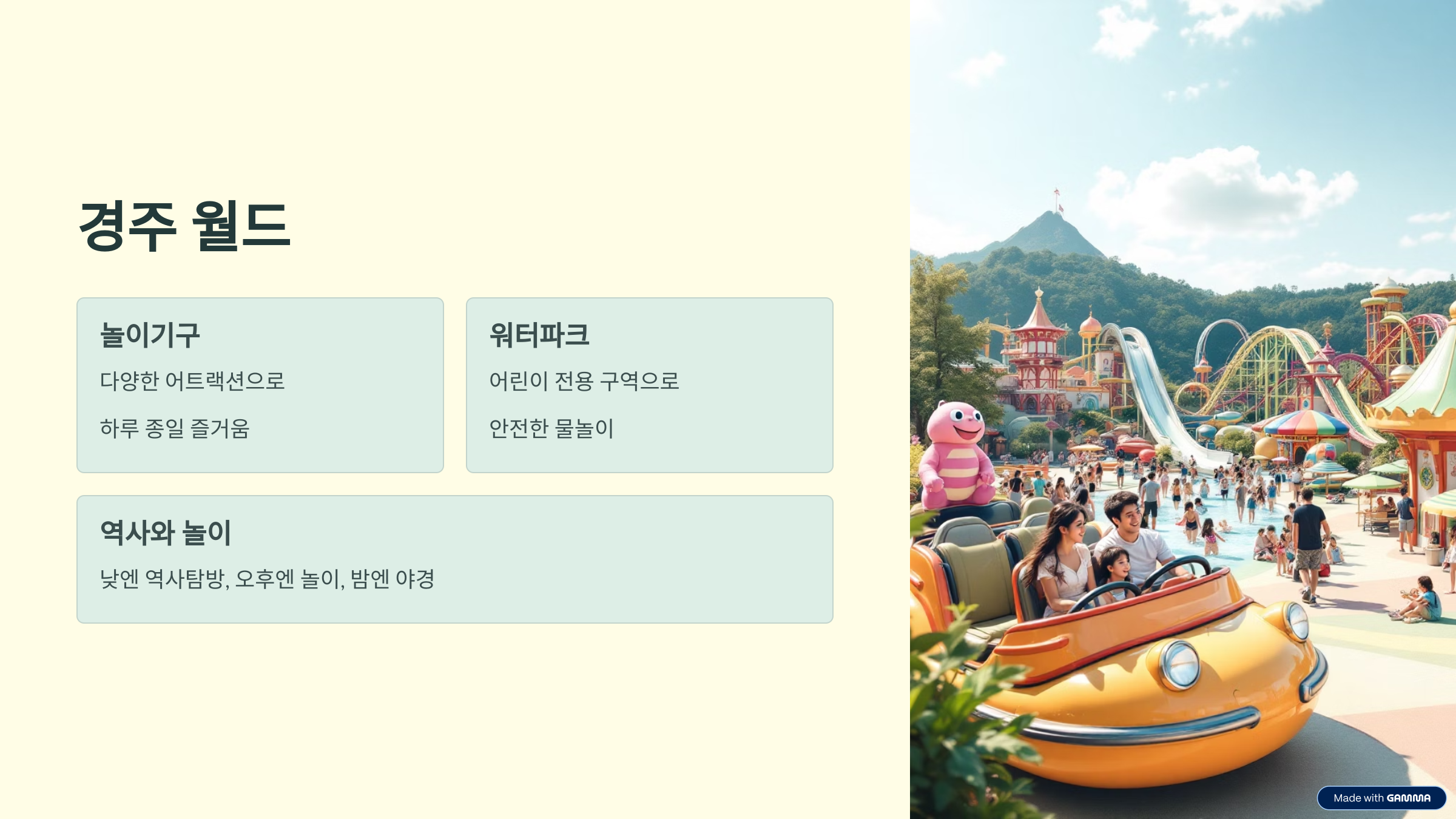 특히 여름철 워터파크는 어린이 전용 구역이 잘 되어 있어서 부모 입장에서도 안심이에요. 경주라는 도시 자체가 문화유산의 도시라 낮에는 역사탐방, 오후엔 놀이, 밤엔 야경 구경까지!