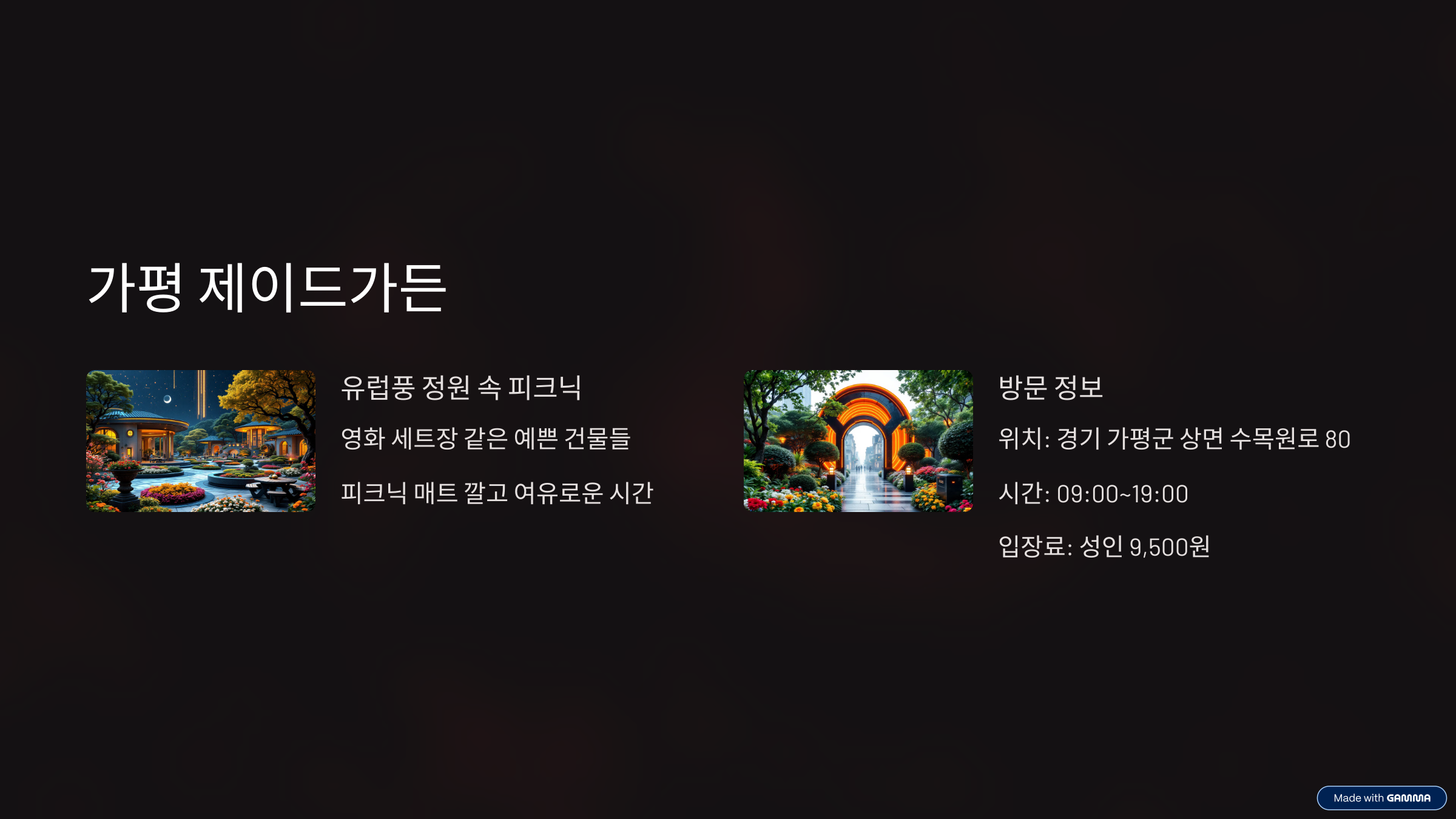 제이드가든은 가평에 숨어 있는 유럽풍 정원이에요. 영화 세트장처럼 예쁜 건물들과 정원, 나무가 어우러져 있어서 걷기만 해도 기분이 좋아져요. 피크닉 매트 깔고 누워있으면 시간이 정말 느리게 흘러가요. 여유로운 하루 보내고 싶을 때 강추!